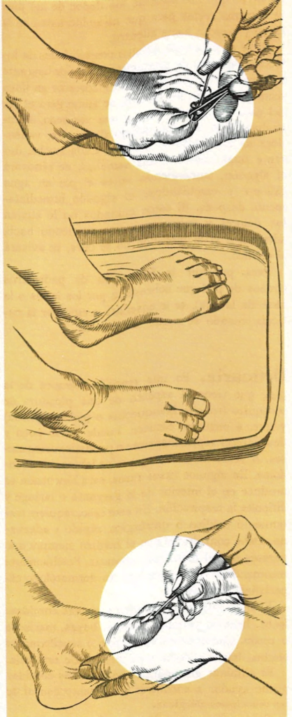 recta y no pulir los bordes, se sumergerá el pie del niño en agua caliente y una vez seco, se introducirá un algodón debajo de la uña, valiéndose de un palillo de dientes. Cada noche, durante unas cuatro a seis semanas, se renovará el algodón, sumergiendo antes el pie en agua caliente y cambiándose el algodón inmediatamente después. Si estos cuidados no le alivian los dolores y evitan que siga creciendo hacia adentro, o si la infección no se cura, se avisará al médico.