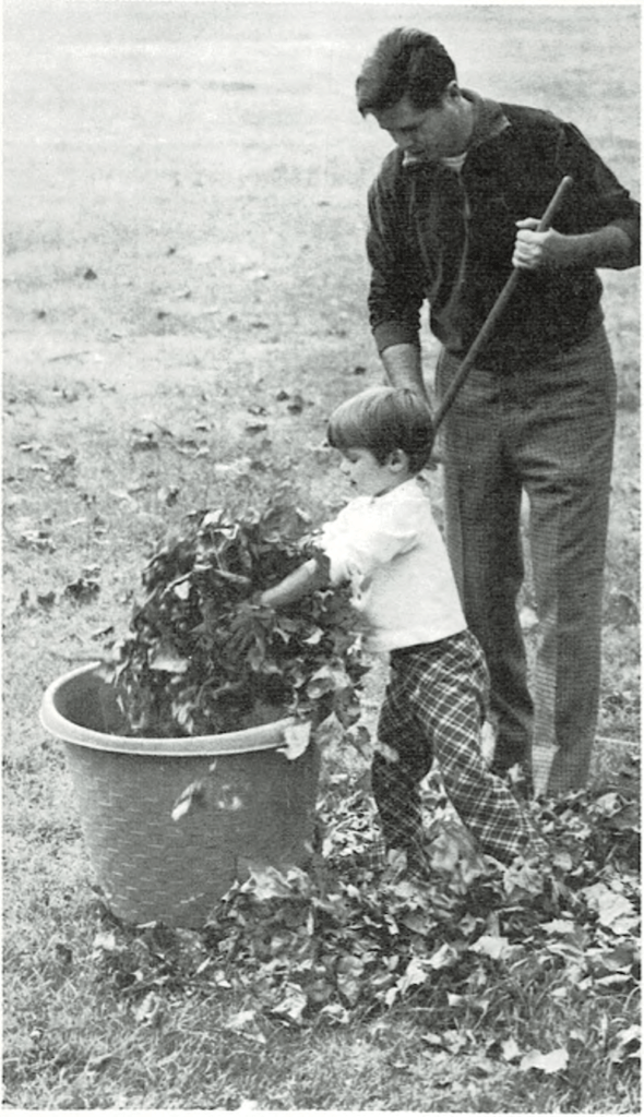 El niño “ayuda” a su padre rastrillando hojas en el jardín.