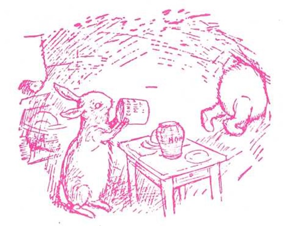 Al oso Fu siempre le gustaba tomar algo a las once de la mañana, y se puso muy contento al ver que el conejo Pip sacaba platos y jarras; y cuando éste dijo: «¿Miel o leche condensada en el pan?», estaba tan encantado que contestó: «Ambas cosas»; y después, para no dar a entender que estaba hambriento, añadió: «Pero no te molestes con el pan, por favor.» Durante un buen rato no dijo nada, hasta que, al final, cantando para sí con voz pastosa, se levantó, dio la pata con mucho afecto al conejo y dijo que tenía que irse.