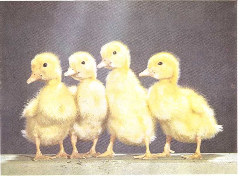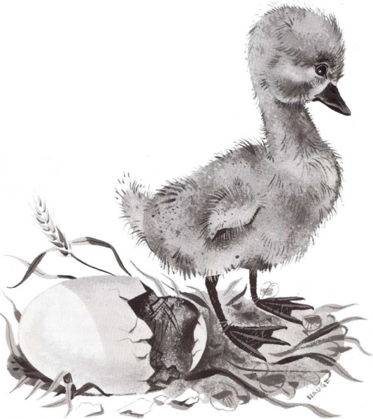 Por fin, uno tras otro, los cascarones se fueron rompiendo: «¡Pip! ¡Pip! ¡Pip!», se oía. Apenas tomaban vida los patitos, ya asomaban sus cabecitas, deseosos de curiosear.