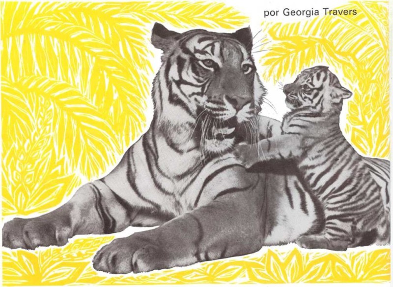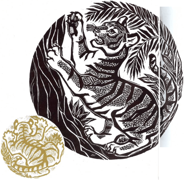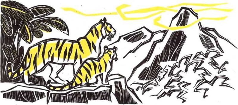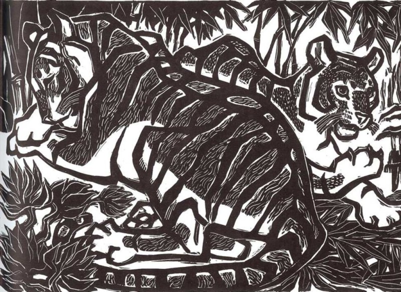 —Eres un tigre pequeño muy fuerte. Pero ahora debes dormir -dijo la madre—. Y ablandó su cama de hojas, le limpió tiernamente con su lengua grande y roja y ronroneó para él hasta que se hubo dormido.