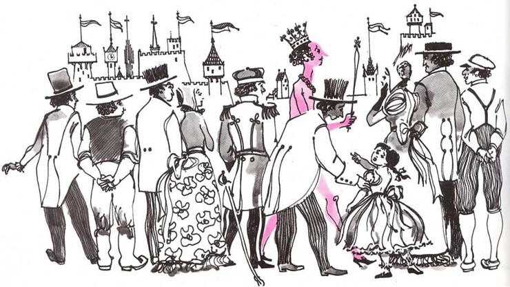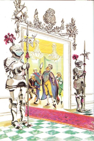 —¡Va desnudo! —acabó por gritar todo el pueblo. Y el Emperador estaba muy disgustado, porque le parecía que tenían razón; pero pensó: «Ahora que ya ha empezado el desfile, ¡adelante!» Y se estiró aún más, y los chambelanes siguieron detrás, tan serios como siempre, llevando un manto que no existía.