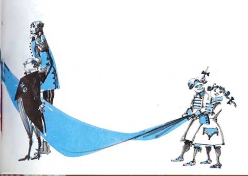 Los chambelanes que tenían que sostener su manto se encorvaron hasta el suelo, como si cogieran la cola. Después, fingieron sostener algo en sus manos, porque no querían exponerse a que el pueblo creyese que no veían nada.