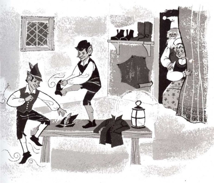 La mujer convino en ello y encendió una bujía. Hecho esto, los dos se ocultaron detrás de una cortina, dispuestos a vigilar. Al sonar la medianoche, vieron entrar en la zapatería a dos hombrecillos desnudos que se sentaron delante de la mesa del zapatero y cogieron el trabajo que estaba allí preparado. Luego, comenzaron a coser, agujerear y clavetear, moviendo sus deditos tan hábil y velozmente que el zapatero, maravillado, apenas podía seguirlos con la vista. Hasta que concluyeron la tarea y la colocaron sobre la mesa, los hombrecillos no pararon ni un momento. Después, se levantaron de un salto *’ y salieron corriendo a la calle.
