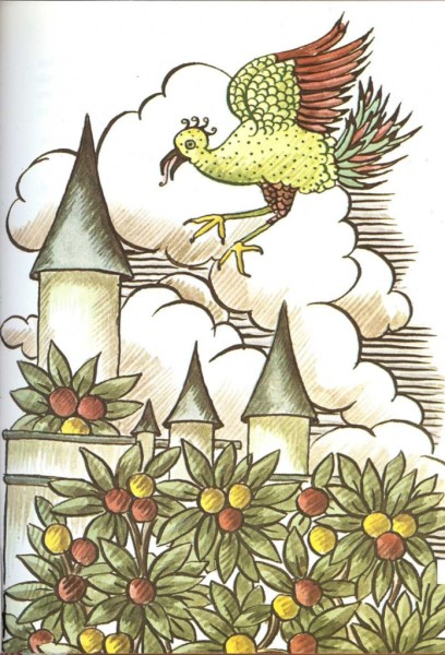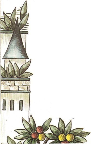 Y, al anochecer, volvió a saltar la valla, como el día anterior. Al lado del melocotonero crecían unas hermosas campanillas azules. Y el hombre pensó: «¡Qué contenta se pondrá mi mujer si, además de los melocotones, le llevo un ramo de estas flores!» Y se agachó para cogerlas. Pero cuando tenía un pequeño manojo, vio asustado que la bruja estaba delante de él.