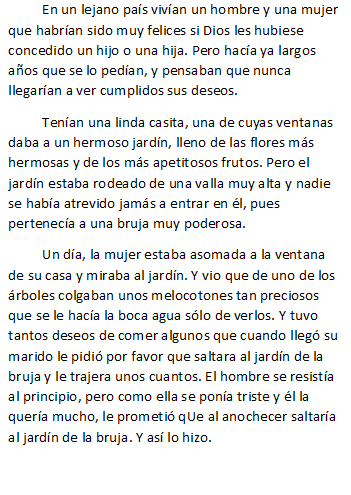 —Bien, hombre; ya que tu mujer los desea tanto, puedes llevarte todos los melocotones que quieras de mi jardín. Pero has de prometerme que si algún día llegáis a tener un niño o una niña, me lo entregaréis en el momento de nacer. No tendréis que sufrir por él: yo lo cuidaré como si fuera su propia madre.