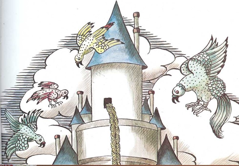 Y, con gran sorpresa, vio cómo caía una trenza de oro por la ventana y cómo la bruja trepaba por ella.