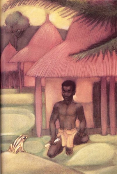 Nzúa se fue a su casa y se sentó a pensar cómo podría hacer para enviar su carta al señor Sol. De pronto, algo frío tocó su dedo gordo del pie. Miró hacia abajo. Allí estaba una rana.
