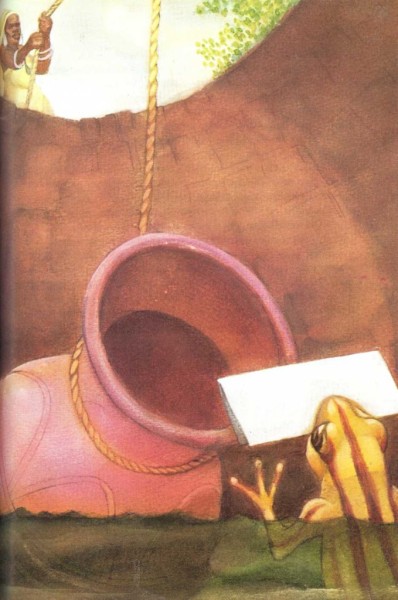 del señor Sol, bajar por una escalera de tela de araña en dirección al pozo llevando un jarro vacío al hombro. Hacía bajar el jarro al pozo. Cuando el jarro estaba lleno, lo sacaba tirando de la cuerda y lo llevaba a la casa del señor Sol. La rana, con la carta entre sus dientes, saltó al pozo. En cuanto la criada bajó el jarro, la rana saltó dentro de él y de este modo llegó a la casa del señor Sol. La criada dejó el jarro sobre una mesa en la habitación donde se guardaba el agua. La rana oyó que se cerraba la puerta. Saltó del jarro y dejó la carta en la mesa. Después, se escondió en un rincón y esperó.