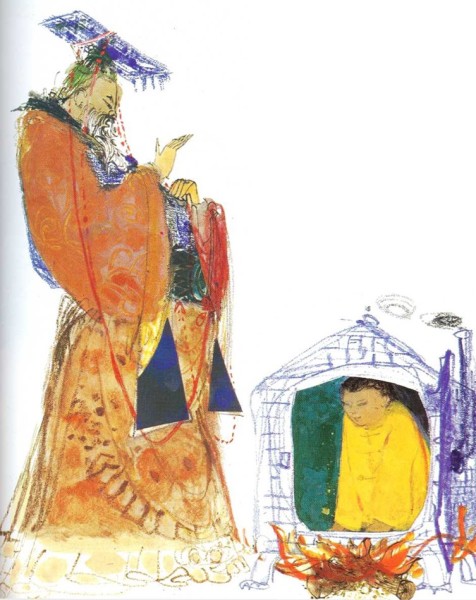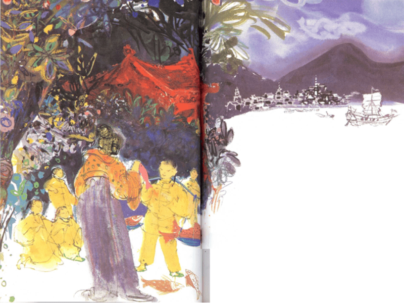 Cerca de la orilla, el Primer Hermano Chino recogió algunos peces, mientras continuaba reteniendo el agua en la boca. Pronto se cansó. ¡Es muy pesado aguantar el mar! Así pues, hizo una señal al muchacho para que volviera. Éste la vio, pero no le hizo caso.