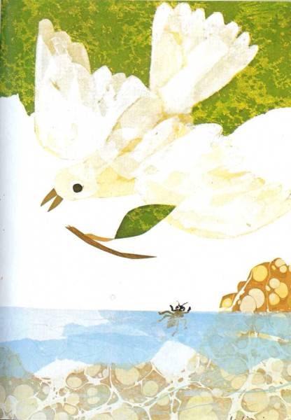 La paloma se dio cuenta de que tenía que actuar rápidamente para salvarla. Rompió una ramita del árbol con el pico. Después, voló sobre el arroyo con la ramita y la dejó caer junto a la hormiga.