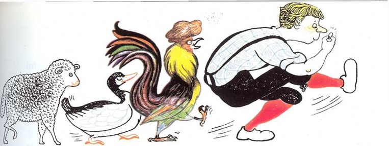 Al cabo de un rato, se encontró de nuevo con otro hombre que llevaba un ganso, y cambió su oveja por el ganso. Más tarde encontró a otro hombre con un gallo, e hizo un nuevo trato con él, porque: «Es mucho mejor tener un gallo que un ganso».