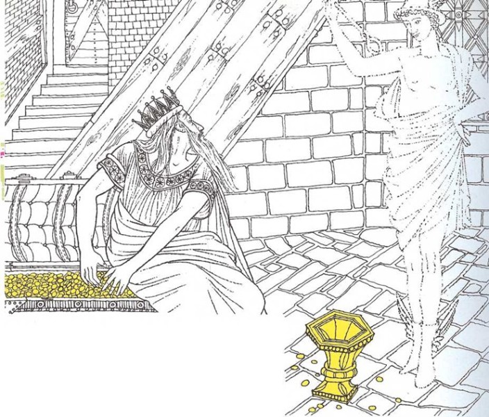 Pero Midas estaba malhumorado. Su único placer era atesorar oro, y nunca parecía tener bastante. Amaba tanto el oro que incluso a su hija la llamaba María Oro. Pasaba muchas horas al día contando las monedas. Y antes de irse a la cama abría los cofres en que las guardaba para mirarlas y tocarlas.