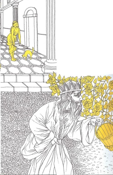 Con cara muy triste, se sentó en su silla de oro, pensando en la suerte que le esperaba. Entonces, el gato saltó a la falda del rey. Éste sin pensarlo, pasó la mano por la suave piel. El gato arqueó la espalda, y su pelo se erizó: al momento, el animal se convirtió en oro. Y los pelos quedaron tranformados en afiladas agujas de oro.