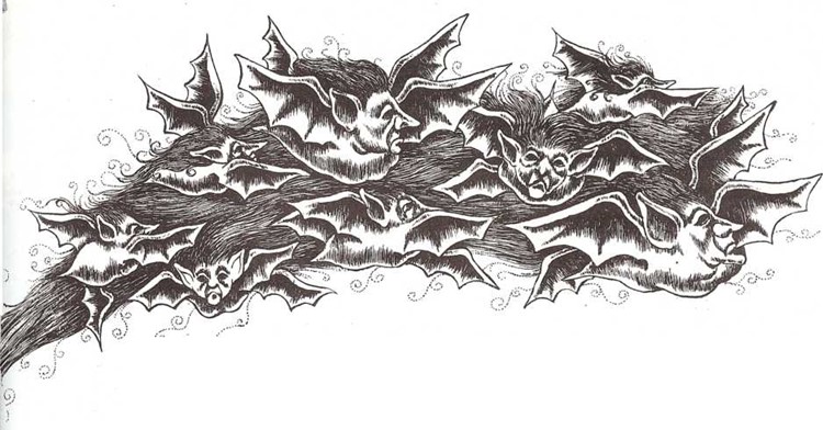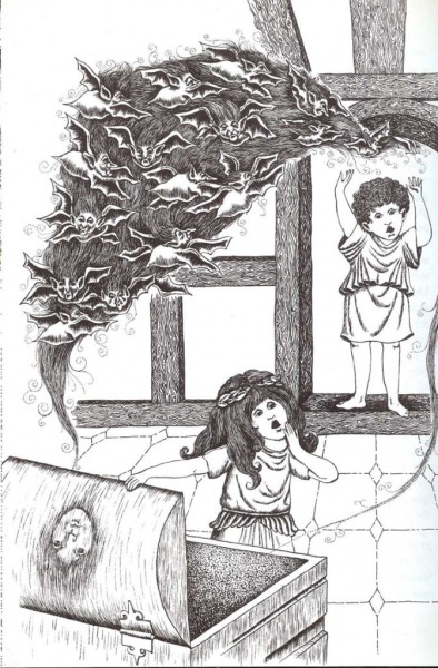 Oyó un gran zumbido, como si moscas y mosquitos de gran tamaño volaran por la habitación. Descubrió una multitud de pequeñas sombras muy feas, con alas como de vampiros, provistas de terribles aguijones en la cola. Una de éstas había picado a Epimeteo, y pronto Pandora comenzó también a chillar de miedo. Un feo y pequeño monstruo se había posado en su frente, y le hubiera picado, sin duda, si Epimeteo no hubiera corrido a espantarlo.