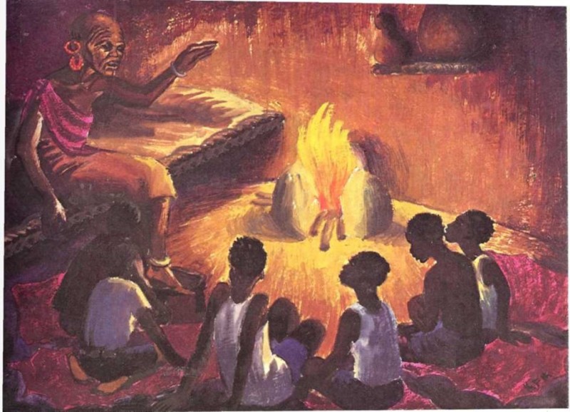 Cuando la abuela pronunciaba estas palabras, los niños dejaban inmediatamente de charlar y se volvían hacia ella. Ella se sentaba junto al fuego, en una cama construida con largos tallos de caña, fijada a las paredes de barro. Los tallos estaban atados con cuerdas y cubiertos con una piel de vaca, para que la abuela estuviera cómoda.