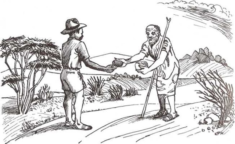 —¿Esperas que te dé dinero? —exclamó—. ¿Por qué había de hacerlo si tengo lo justo para vivir feliz? Si te doy un poco, no tendré nada que hacer durante el día. El mayor placer de mi vida es contar dinero. Y, ¿’por qué tengo que darte dinero? Tú eres perezoso, pero te daré algo sólo para demostrarte lo bueno que soy contigo, aunque no te merezcas nada. Aquí tienes una barra de pan. Ahora, vete y no vuelvas nunca más —dijo, tendiéndole una gran barra de pan seco.