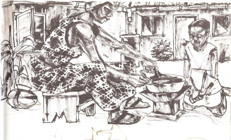 Los botes, cazuelas, sartenes, cucharas, cuchillos y demás cacharros de la cocina no entendían bien lo que ocurría. El hornillo explicó que Mame Nyame quería romper el fogón y echarlo a la basura.