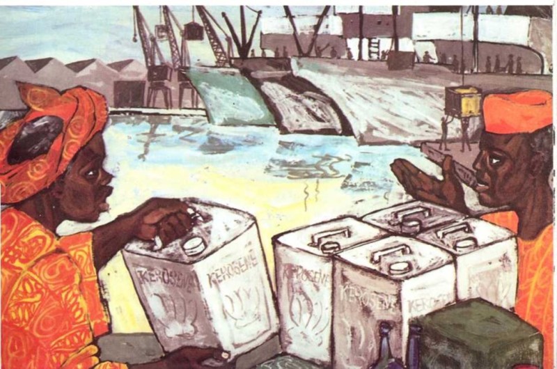 —Una mujer me compró en Port Harcourt. Pronto consumió todo el petróleo que yo guardaba dentro. Pero esto no fue el fin, porque después me limpió cuidadosamente y me utilizó para llevar agua. Era muy buena conmigo y siempre me conservaba limpio y brillante. Trabajé para esta mujer hasta que un día resbalé de sus manos y caí sobre una piedra que me hizo un agujero en el costado. Ya no servía para llevar agua; así que la mujer me vendió a un hombre