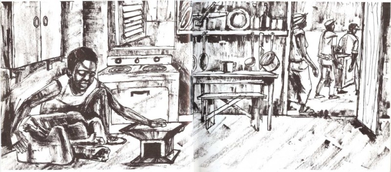 Entonces Yaa entró en la cocina. Parecía también triste. Cogió el hornillo, lo puso cerca del fogón y se sentó entre ellos.
