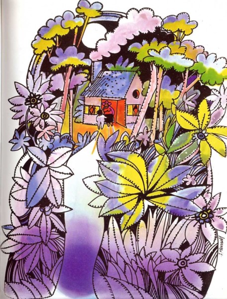 Y quitándose la corona, salió de la ciudad disimuladamente, empezó a correr por un senderito, y no paró hasta llegar a la casa de Isabel, Isidra e Inés, que le dieron de merendar, sentándose los cinco a la mesa. Los cinco, porque también se sentó el perrito.