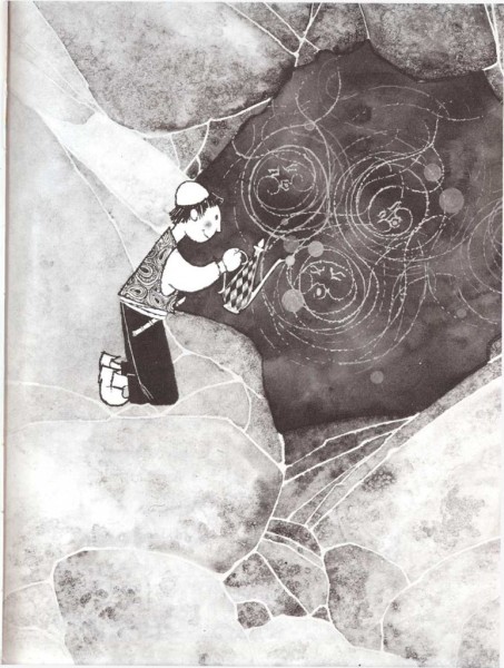 «E1 camino se hizo más difícil y la marcha más lenta a medida que el pequeño pastor se acercaba a la cumbre de la montaña. Pero siguió adelante, sosteniendo muy fuerte el jarro para evitar que su mágico contenido se derramara. Muy tarde, en el silencioso anochecer, llegó a la cima de la montaña.