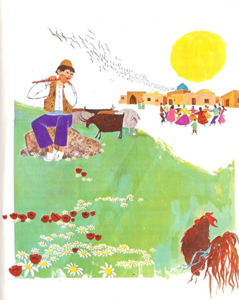 «Los aldeanos habían cambiado sus vestidos y trabajaban en el campo. Todo el mundo estaba ocupado. ¡Era primavera, la estación del trabajo duro! Omid Alí se dijo: —La primavera ha venido y ya estoy preparado. Sacó su rebaño del establo y partió.