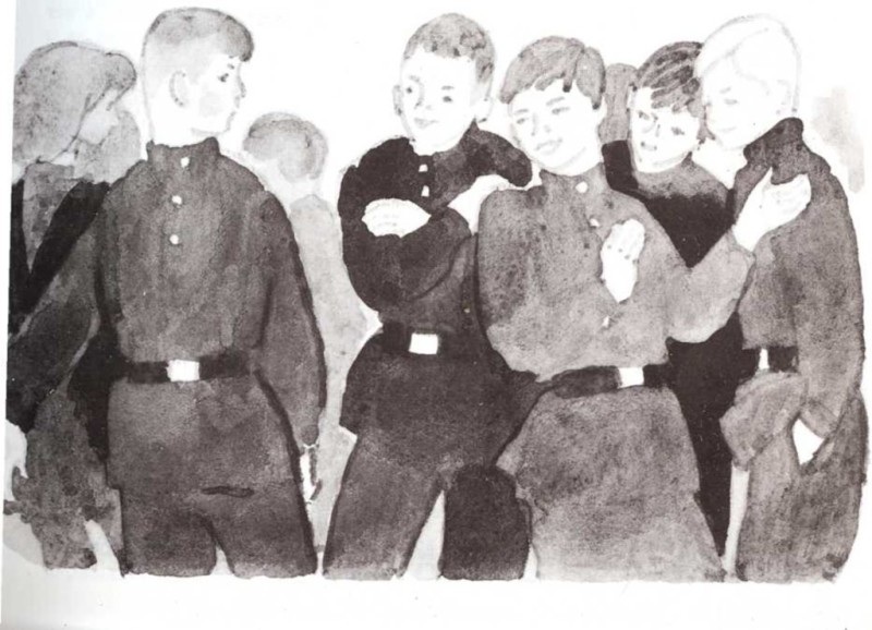 —Habéis oído al mocoso. Le molesté. El primer día de clase y ya está tratando de mandonear. Nadie puede respirar sin su permiso. ¡Un pelirrojo, mimado del maestro! —dijo Levushkin.