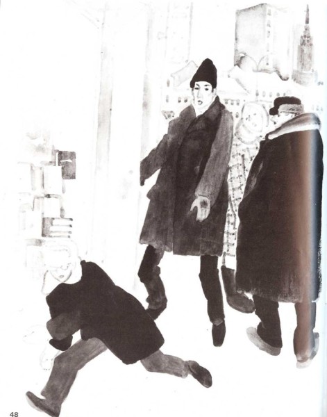 El maestro miró a su alrededor para ver con quien hablaba. Allí estaba Kniajin. Había algo nuevo en él, pero el maestro no se dio cuenta hasta que advirtió que el chico llevaba lentes. Unos pequeños lentes, de niño, con franja de metal. Kniajin se ruborizó; mejillas, orejas, incluso la nariz se le pusieron como la púrpura.