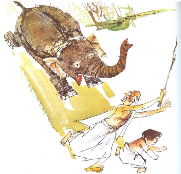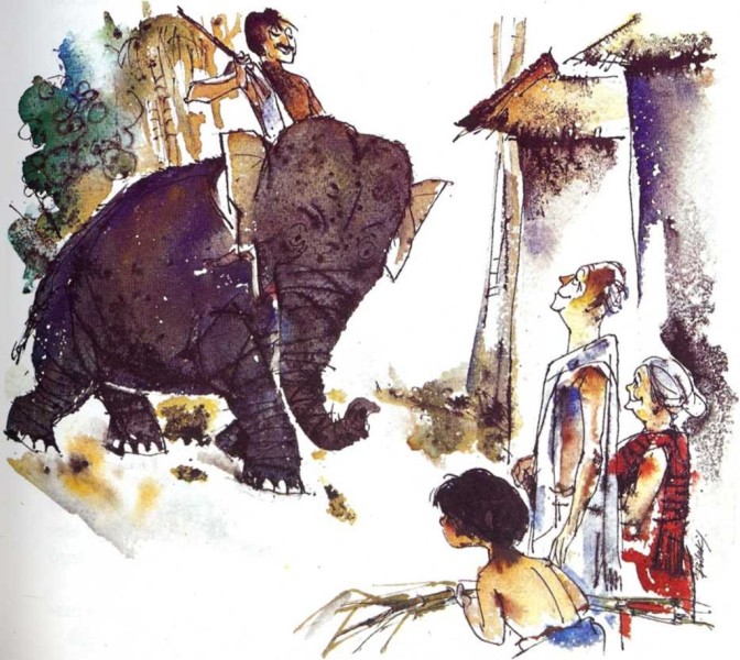 Llegó la noche y ataron a Lakshmi a un árbol en el patio. Raja se sentó un largo rato allá, contemplando al elefante. Le hubiera gustado quedarse más tiempo, pero llegó la abuela y le dijo.