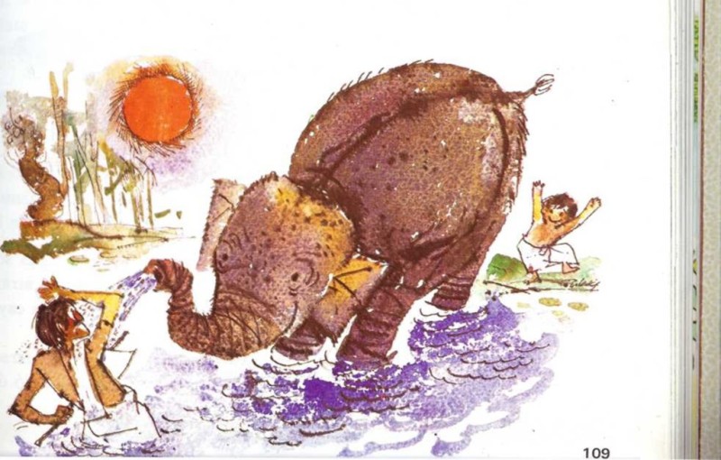 Kittu no se enfadó. Le dijo otra vez a Lakshmi que se sentara. Pero éste no le hizo caso y llenó otra vez la trompa de agua. Kittu le mostró su bastón y le advirtió que no repitiera la fechoría. Esta vez Lakshmi no arrojó el agua sobre él, sino que doblando la trompa, la lanzó hacia atrás, con fuerza. Raja estaba de pie detrás de ellos y el agua cayó sobre él. Fue muy divertido. Todo era un juego.