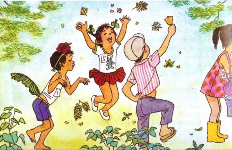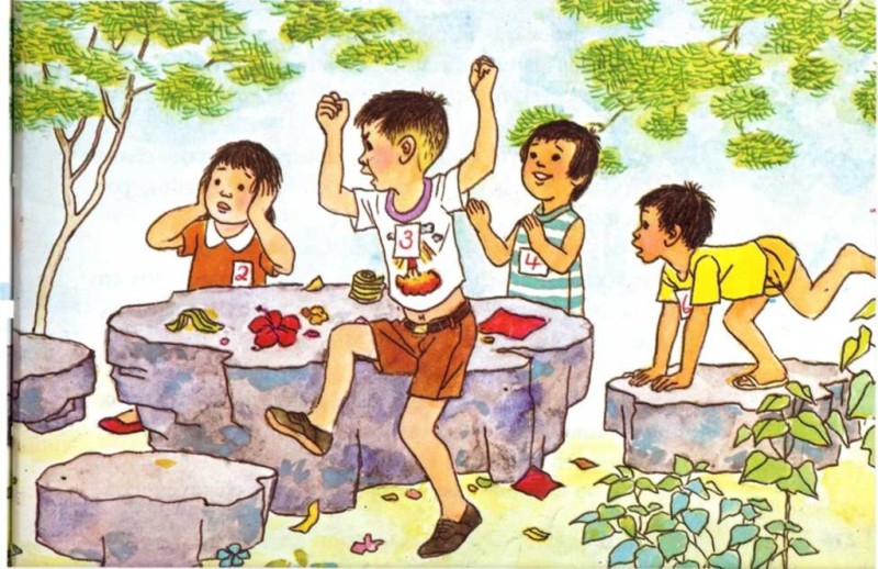 —¡Aún no! —gritó Chiao-yen—. El juego no ha comenzado. Primero tenemos que recoger florecillas rojas y ponerlas en agua. Será el vino de Año Nuevo. Cogeremos también florecillas amarillas, y serán el pastel y las tartas de Año Nuevo.