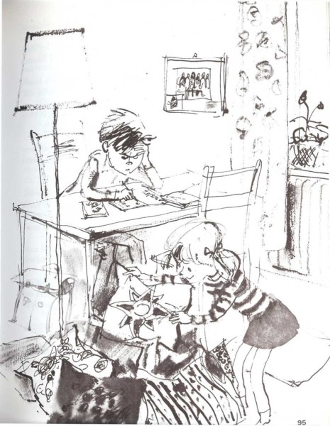 Helmut no prestaba atención a su hermana. Con la pluma trataba de trazar una línea recta, debajo de los números, en una página del cuaderno. De repente, su pluma saltó y la línea atravesó la columna de números. Susana le había lanzado una almohada.