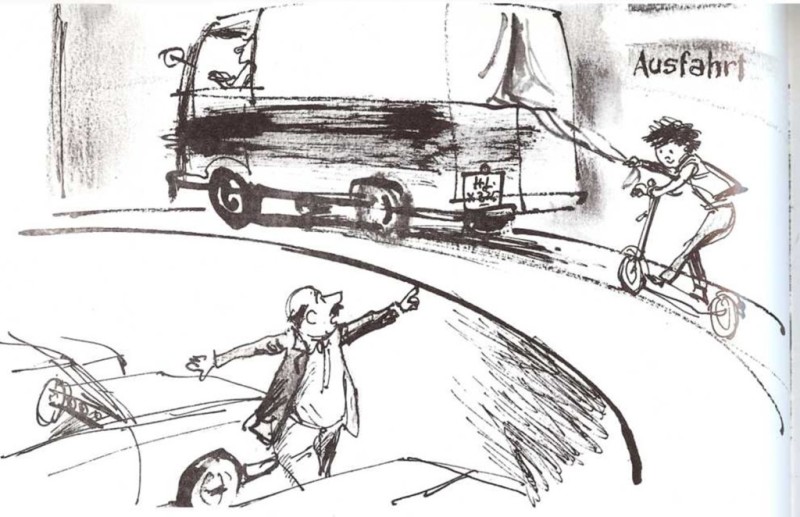 Entretanto, Helmut vio a Sigi montado en el patinete, detrás de un camión de reparto, que se dirigía velozmente al supermercado.