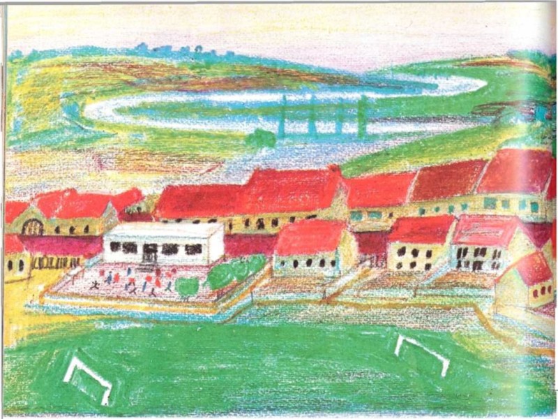 frente a la iglesia, la fuente delante de la forja del herrero y la elegante y moderna escuela, al lado del campo de fútbol.