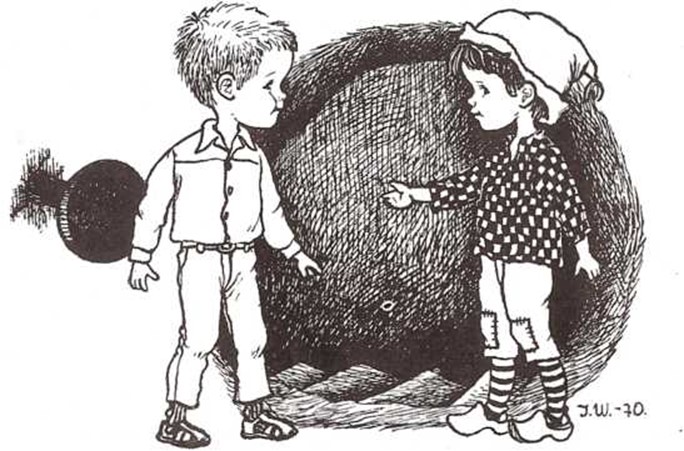No había por qué gritar, porque Nils estaba allí, esperándole. Lo llevaron todo abajo. Los ojos de Nils brillaban como estrellas. La albóndiga era casi tan grande como él. Comenzaron a comerla, cada uno por un lado, para ver quién llegaba antes al centro. Fue Nils quien ganó.