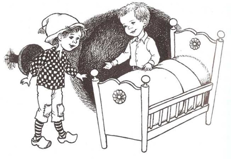 Al día siguiente, Bertil esperó impaciente que sus padres se marcharan. Normalmente Bertil se quedaba en el vestíbulo y decía adiós con cara triste. Pero no ocurrió asi aquel día. Tan pronto como se cerró la puerta, se arrastró debajo de la cama y se fue abajo, con Nils. El enanito ya se había levantado y había encendido fuego en la chimenea.
