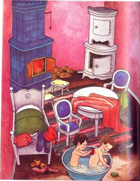 Se echaron después agua el uno al otro. Se envolvieron en las toallas y se sentaron en los taburetes, frente al fuego, charla que te charla. Bertil fue arriba a buscar un poco de azúcar y una manzana que asaron al fuego.