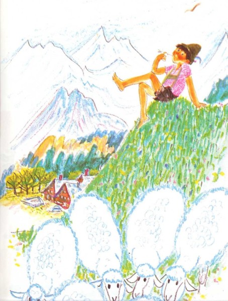 El pequeño Raimund, a quien todo el mundo llamaba «Raimi», estaba sentado sobre la suave hierba cuidando las ovejas de la granja Holz. Cuando las ovejas pacían tranquilamente, no ofrecían ningún problema. De vez en cuando una gran piedra rodaba montaña abajo, produciendo un fuer-te estrépito. Rum, rum, rum. Entonces las ovejas se escapaban en todas direcciones. Pero pronto regresaban. Raimi cuidaba del rebaño todo los días desde muy temprano hasta la noche.