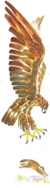 Raimi vio una sombra enorme, de color gris oscuro, que cayó exactamente sobre el sitio donde las marmotas estaban hacía sólo un segundo. Se puso de pie de un salto y empezó a agitar sus manos mientras gritaba con toda la fuerza de sus pulmones. Allí estaba lo que había asustado a las marmotas. Un águila real volaba sobre él. Los gritos de Raimi y el movimiento de sus brazos la alejaron. El águila describió unos cuantos círculos y finalmente desapareció tras el pico de la montaña.