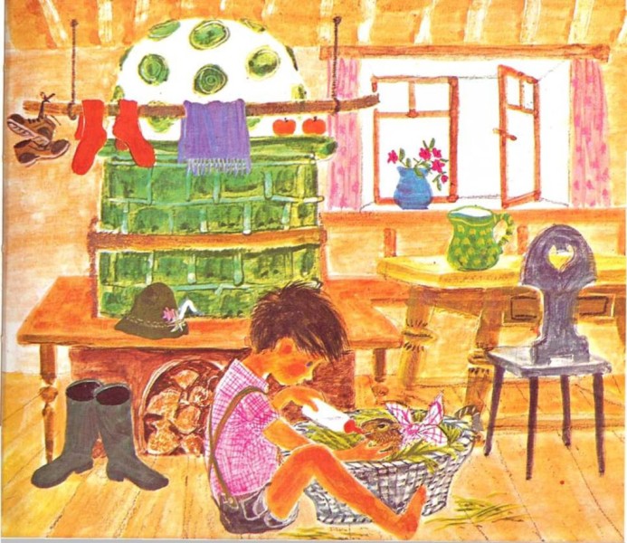 En un viejo cesto Raimi hizo un lecho de paja y puso dentro a la marmota. Después le dio leche caliente. Y, ¡maravilla de las maravillas!, al cabo de dos semanas, la marmota estaba ya completamente bien.
