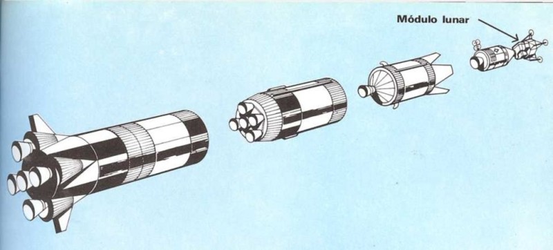 El cohete que se eleva hacia la Luna está formado por tres bloques. Cada bloque lleva depósitos de combustible y motores de cohetes. Cuando un bloque ha consumido todo su combustible, se desprende de la nave espacial y se enciende el siguiente. El tercer bloque se desprende después de haber logrado hacer salir la nave de la órbita de atracción de la Tierra y haberla encaminado hacia la Luna.