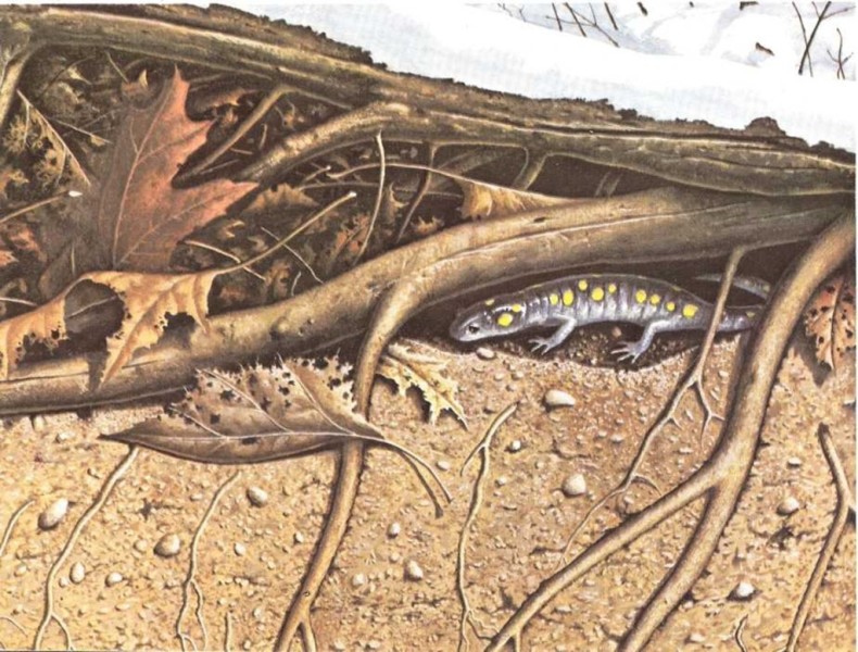 Los anfibios tratan de calentarse. Las ranas y sapos se refugian en agujeros muy hondos que encuentran o excavan ellos mismos. Ciertas clases de lagartijas y salamandras se esconden debajo de troncos, piedras o montones de hojas. Algunas salamandras y ranas se encierran en el barro del fondo del lago o río donde viven.