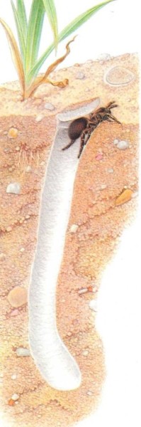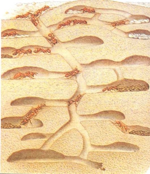 La vivienda de una araña migala es un túnel con una puerta hecha de seda y desperdicios. Las hormigas cosecheras viven en túneles que excavan en el suelo. |