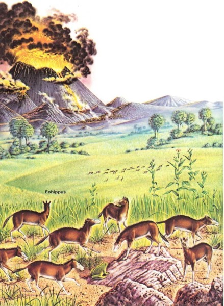 Si vieras un caballo como los que vivieron hace sesenta y cinco millones de años, no creerías que aquello fuera un caballo. Aquellos caballos tenían dedos en los pies, en lugar de pezuñas. Comían frutas y hojas, en vez de hierba. Y no eran mayores que los gatos.