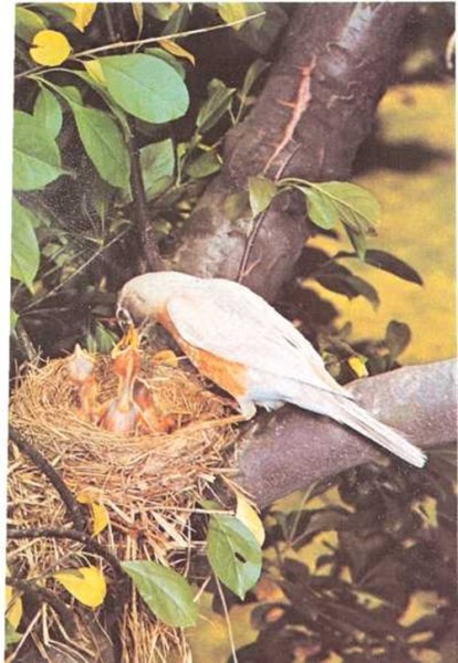 Con un batir de alas, la madre de los pequeños se posa en el nido. En su pico lleva un gusano que se retuerce. Los pequeños abren desmesuradamente su boca como diciendo: ¡A mí, a mí, dámelo a mí!