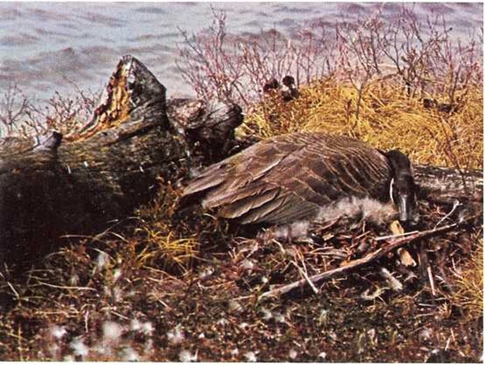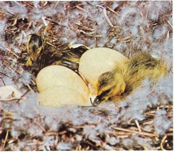 La hembra hace un nido de hierba y plumas, pone en él los huevos y los calienta.