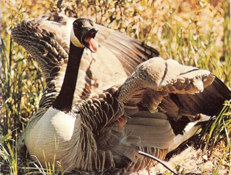 ¡Cuidado! Un animal se acercaj La oca bate sus alas y se pone a graznar. El animal se asusta y se va.