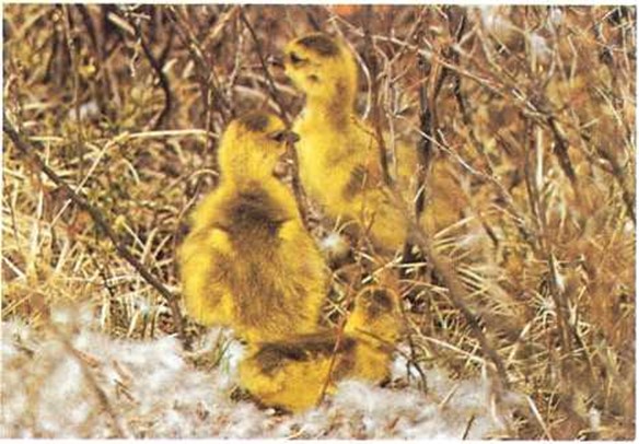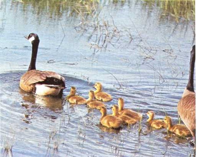 Las pequeñas ocas pueden nadar casi enseguida de nacer. Cuando tienen un día, abandonan el nido para darse un paseo.