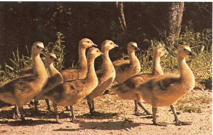 A las dos semanas de nacer, las pequeñas ocas andan torpemente de un lado a otro aprendiendo las cosas de la vida.